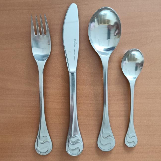 Tafelcouvert bestaande uit een tafelmes (holheft), tafelvork, tafelvork en koffielepel.